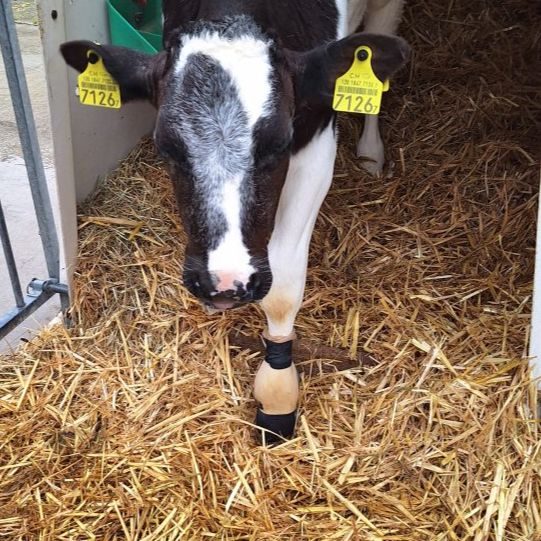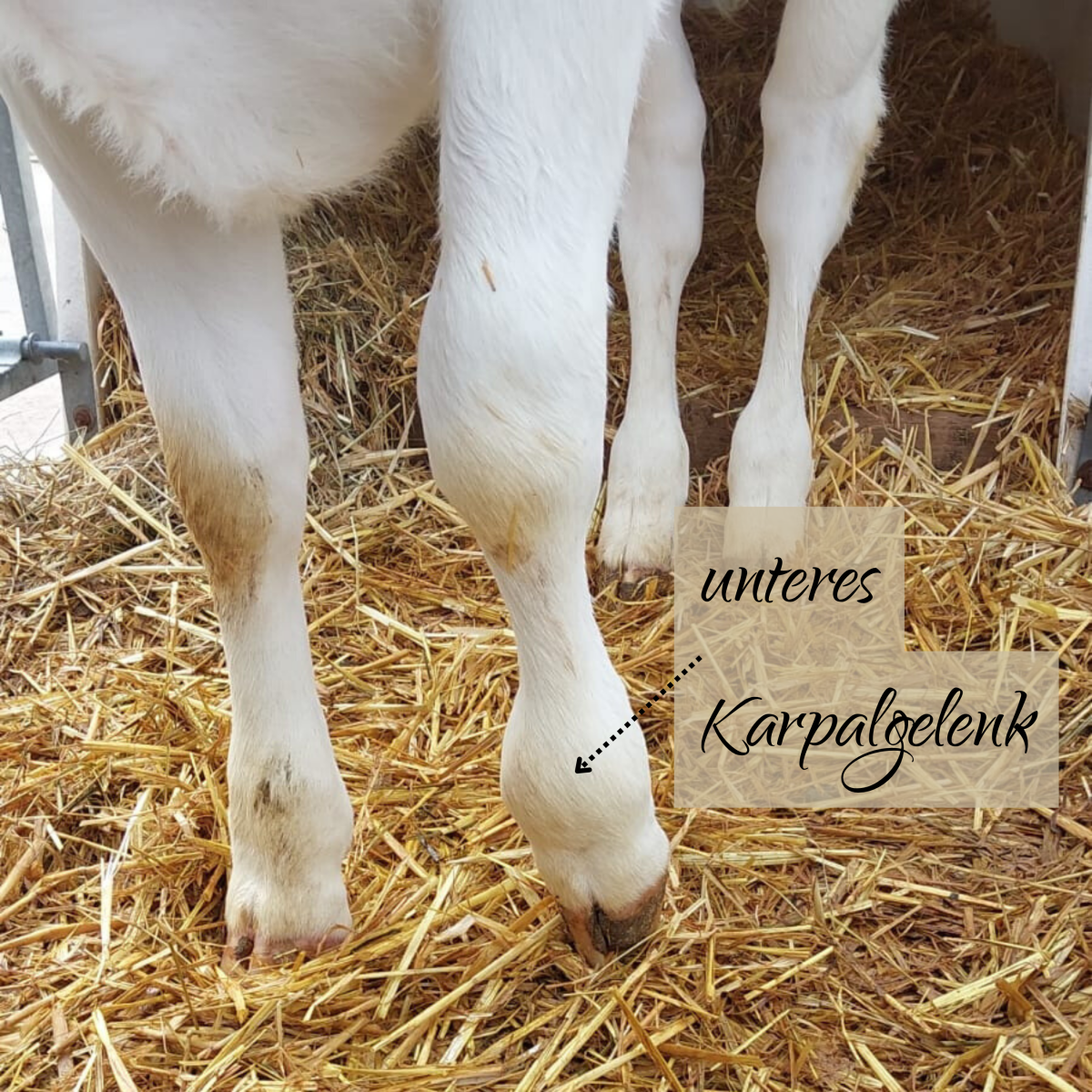 Bobby, ein 4 Wochen altes Kalb auf einem Milchviehbetrieb zeigt Ende April 2025 eine Verdickung am unteren Karpalgelenk vorne links. Das Bein wird nur wenig belastet, und das Tier reagiert auf Berührung an der entsprechenden Stelle: es scheint schmerzhaft zu sein.